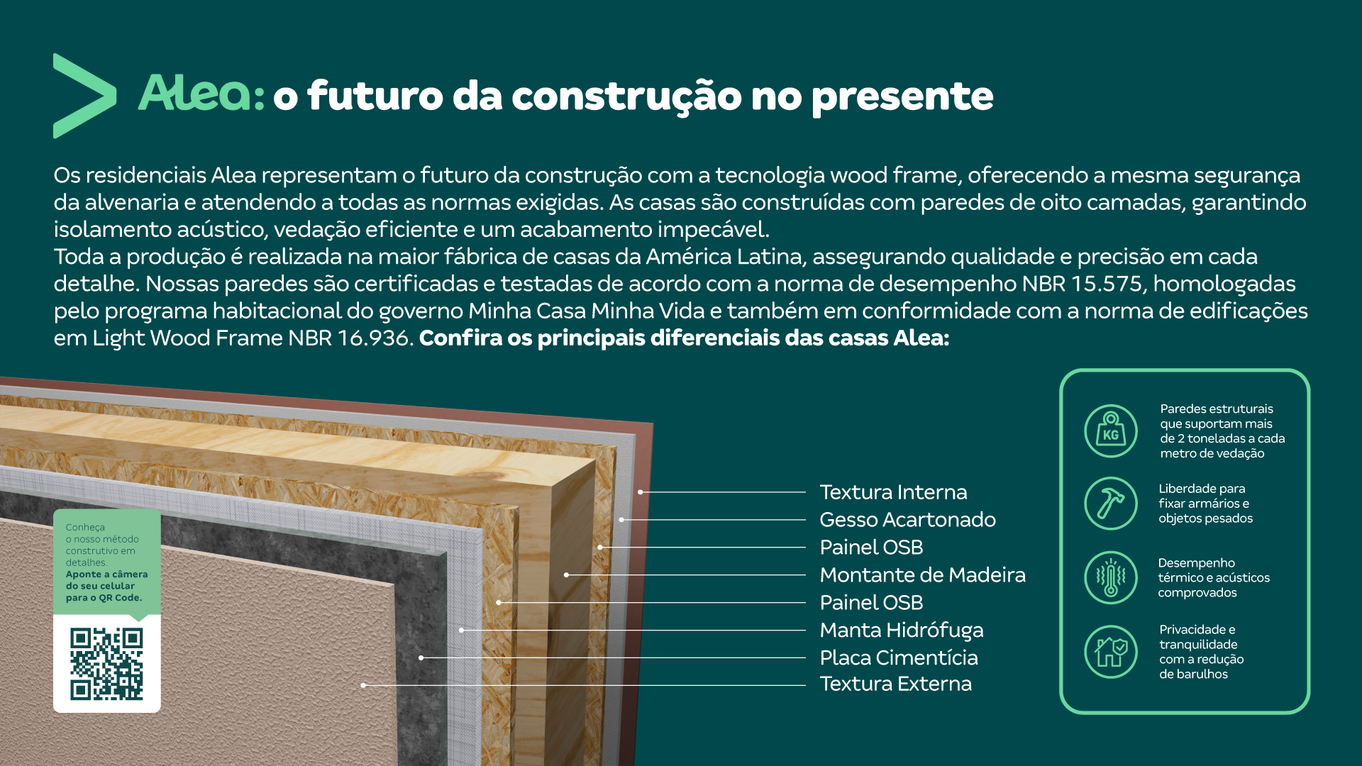 As casas Alea são produzidas com um método construtivo de alta tecnologia, criado nos Estados Unidos e usado em diversos países do mundo. Projetadas para serem resistentes, confortáveis e com excelente isolamento acústico, oferecem uma nova maneira de viver com mais qualidade e inovação.